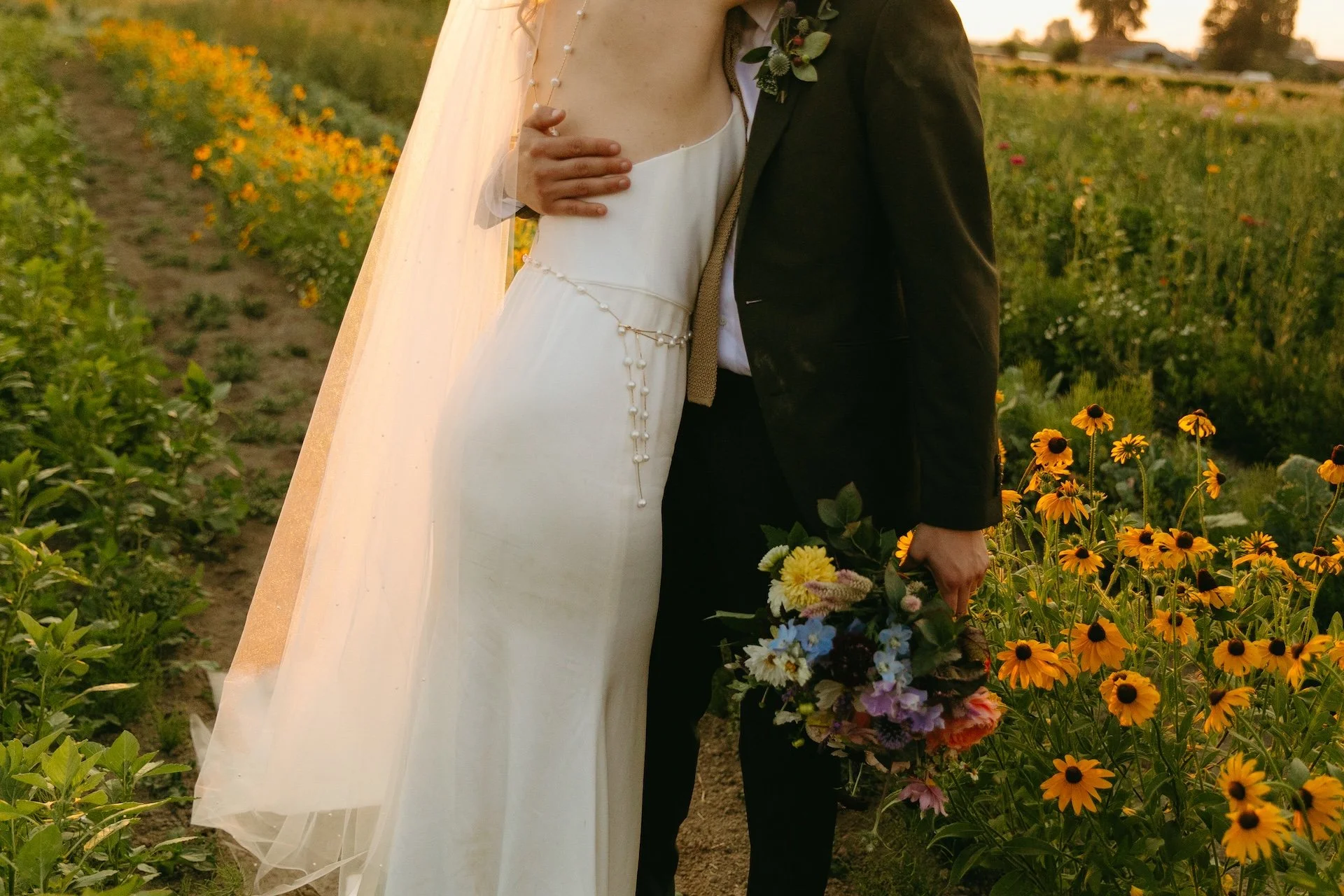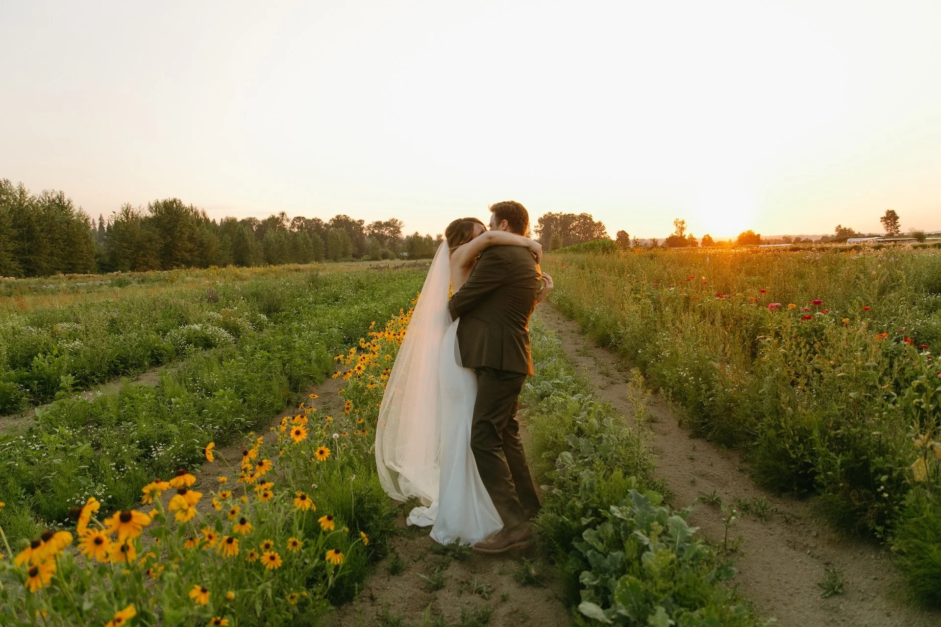 Okay, let’s talk golden hour, because while the whole day was stunning, the golden hour portraits were unforgettable. After the reception started, we hopped in the car and drove two minutes down the road to this random roadside flower field! Just picture Ellen & Cody in their wedding attire, trying to walk through dirt in heels and dress shoes, laughing so hard they could barely stay upright.